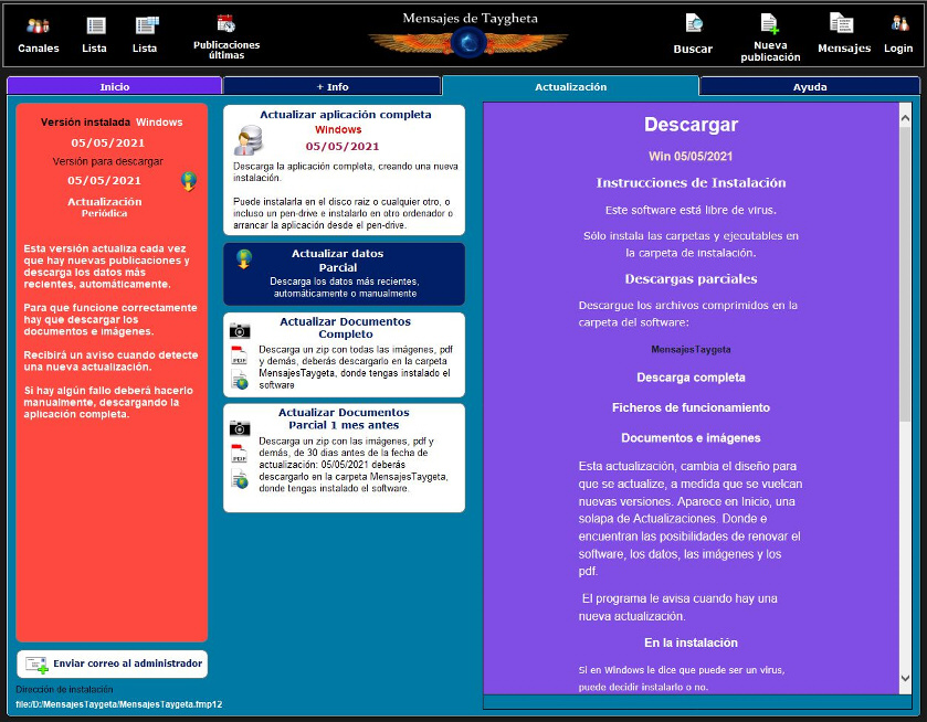 ![]() | La versión completa contiene todos los ficheros, las imágenes, los pdf y demás, cada ve será más voluminosa, así que estamos trabajando para desarrollar un sistema secuencial. Puede instalar la aplicación en cualquier lugar, incluso en un Pen-drive, pues no instala recursos en su equipo, sólo la carpeta. Puede pasarla a un USB y copiarlo en otro ordenador, Si un amigo no tiene internet puede paar la carpeta del USB a su ordenador y arrancara, pulsando en el archivo MensajesTaygeta.exe, dentro de la carpeta raiz. |