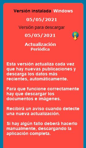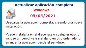 ![]() | Panel indicador de la versión instalada y la versión que esta para descargar. Al arrancar el software, si detecta una actualización un panel emergente le avisará y le pedirá si desea actualizar la aplicación. El tiempo para actualizar depende de la velocidad de internet que disponga y la potencia de su ordenador. Cuando termina la actualización, vuelve a la pantalla Inicio. Si se produce algun fallo por fallar internet por mas de 20 sg. o se apaga el ordenador, deberá descargar la versión completa. |