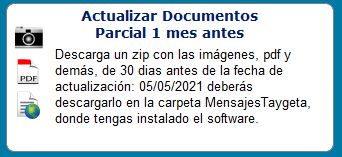 ![]() | Actualizar documentos prcialmente es una buena opción, sólo descargaría los ficheros de los últimos 30 dias.o es una opción, pera resolver situaciones en las que no puede visualizar imágenes o pdf. El fichero comprimido puede tener unos 400 mb. Dependiendo de las publicaciones que hayan habido. |