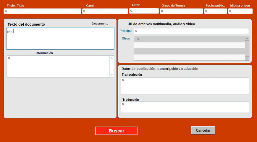 Puede escribir en cualquier casilla, por ejemplo la imágen inferior, si escribe Jung en texto del documento, y pulsa en Buscar, el resultado es la imagen inferior.